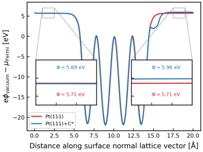The Figure to the right shows a representative example of the vacuum potential obtained by averaging the contents of LOCPOT. This potential is referenced to the Fermi energy and is plotted against the distance along the surface normal (x axis) for two systems, fcc Pt(111) surface (in blue) and Pt(111) surface with a carbon atom adsorbed on one surface termination (Pt(111)-C*). The vacuum potentials are flat, (i.e., constant), on either side (magnified in insets). The work function on either side of the slab is annotated in the insets as [math]\displaystyle{ \Phi }[/math]. It is equal for both sides of the clean slab but slightly higher for the case of Pt(111)-C*.
