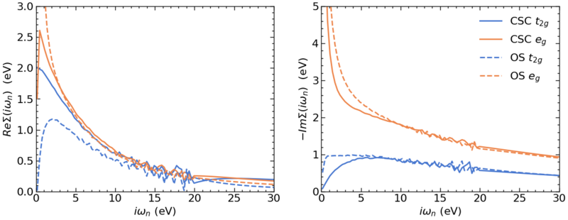 The [math]\displaystyle{ e_g }[/math] orbital is now closer to half filling and, thus, more insulating. The large self-energy for [math]\displaystyle{ i \omega_n \rightarrow 0 }[/math] is signaling a pole in the self-energy at [math]\displaystyle{ \omega=0 }[/math] typical for a Mott insulator.