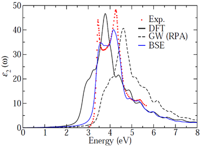 • The calculated dielectric function of Si is at this point (GW+BSE) already in much better agreement with experiment. However we can do even better as shown in the following figure: