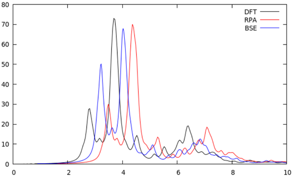 • By using the script ./plotall.sh we get the absorption spectra within the independent particle picture and with BSE: