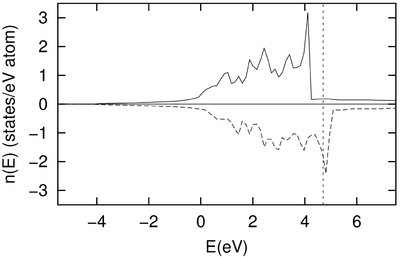 Calculation of the partial DOS of spin-polarized fcc Ni, a ferromagnet.