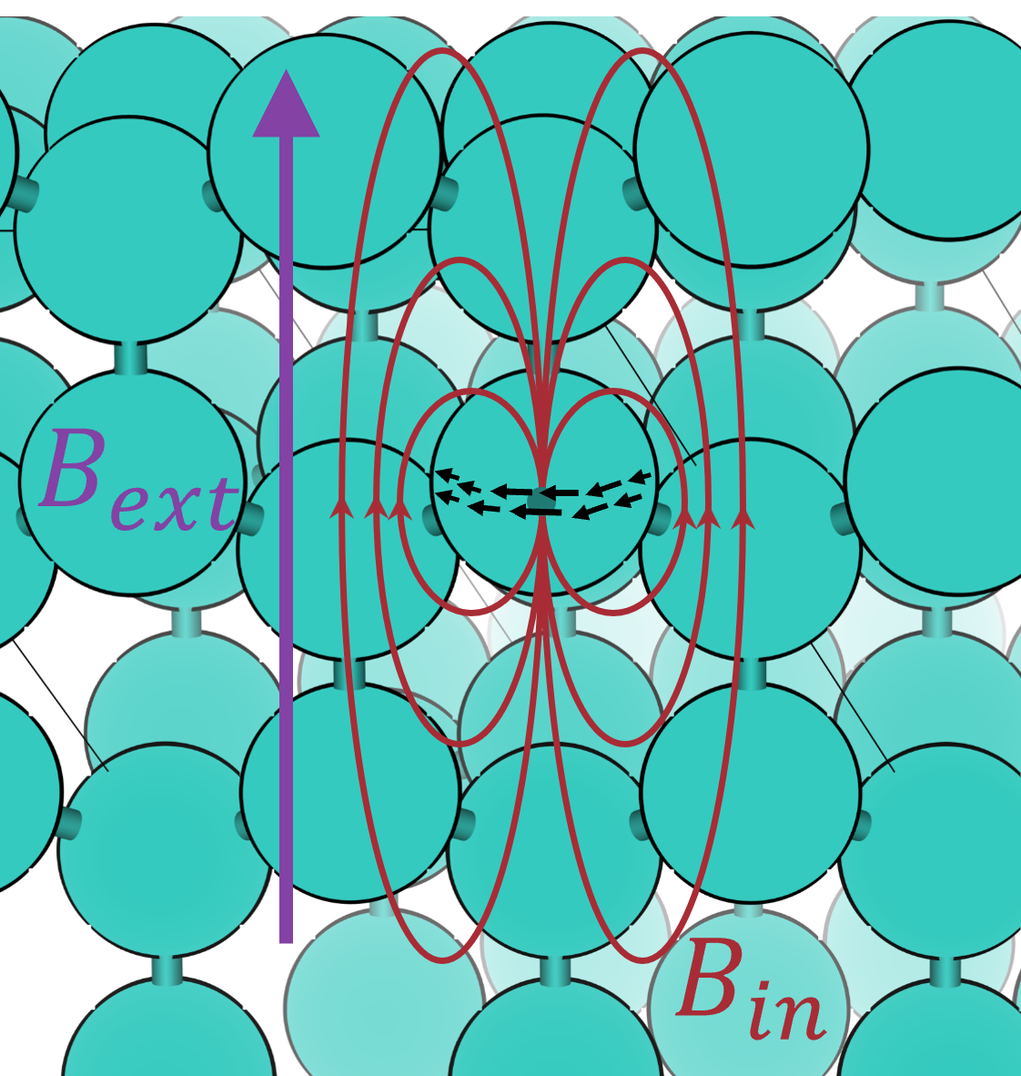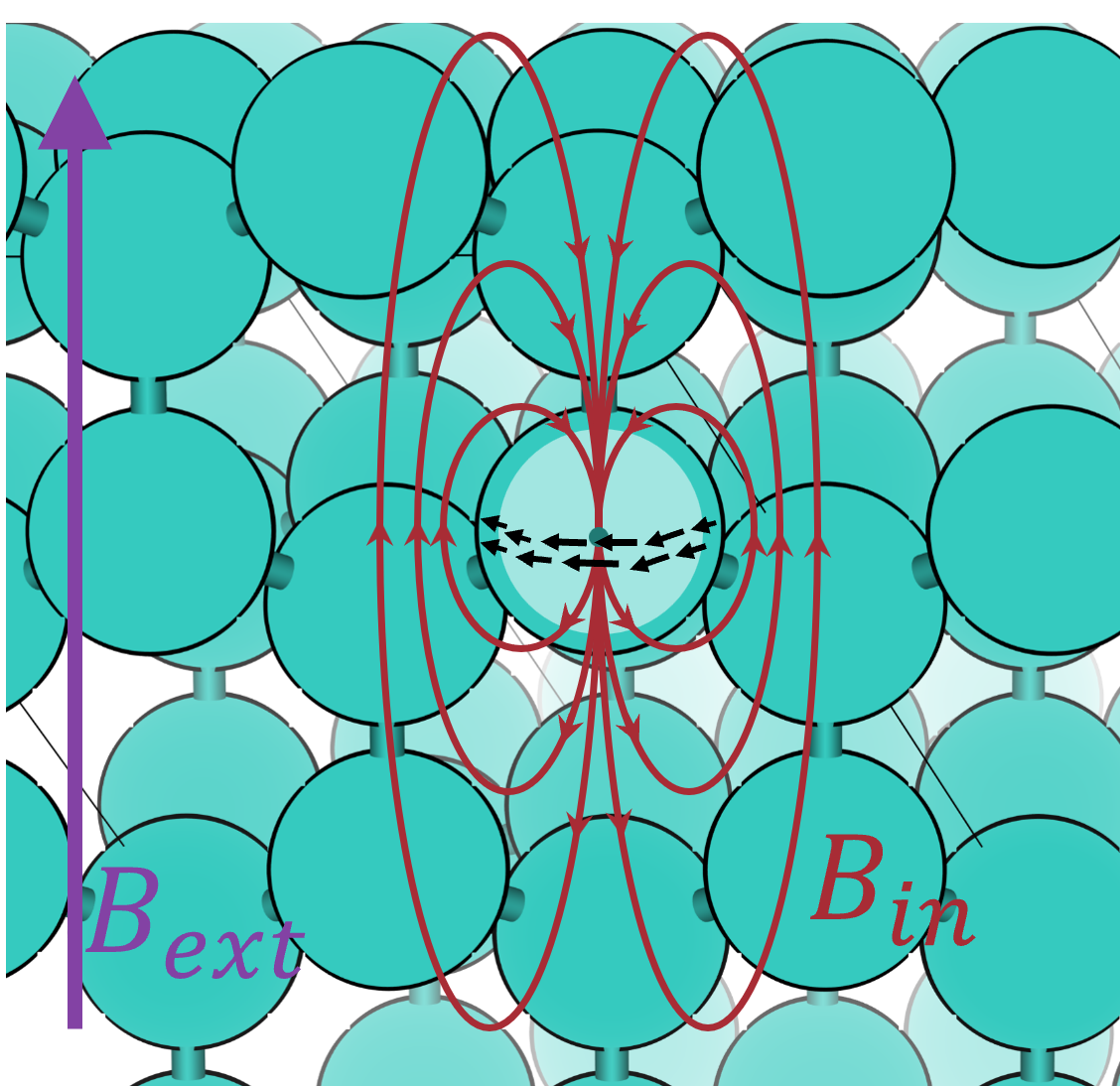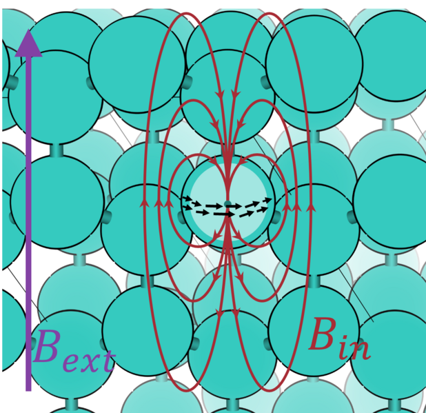 16:48, 26 February 2025Thumbnail for version as of 16:48, 26 February 20251,122 × 1,182 (573 KB)Csheldon (talk | contribs)The external magnetic field B_ext induces currents in the electrons in atoms. These currents in turn induce an opposing magnetic field B_in, reducing the magnetic field at the position of the nucleus, effectively shielding the nucleus from B_ext.