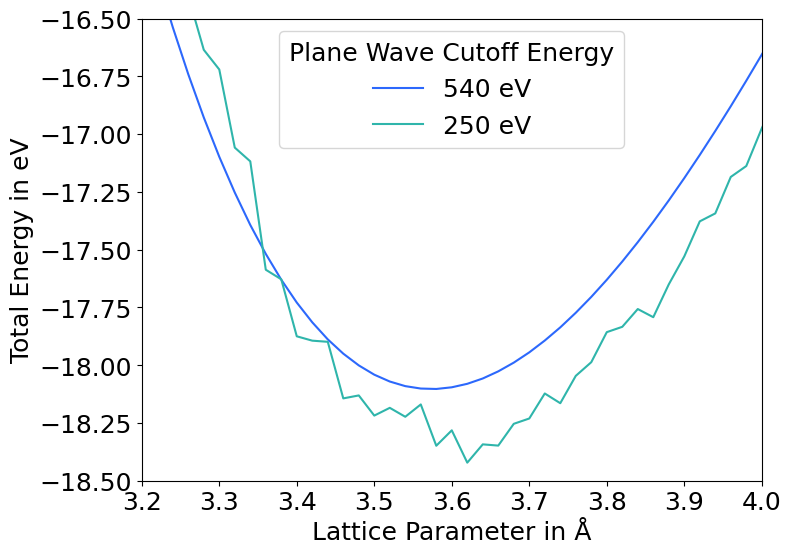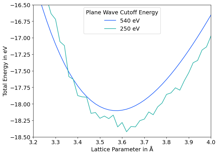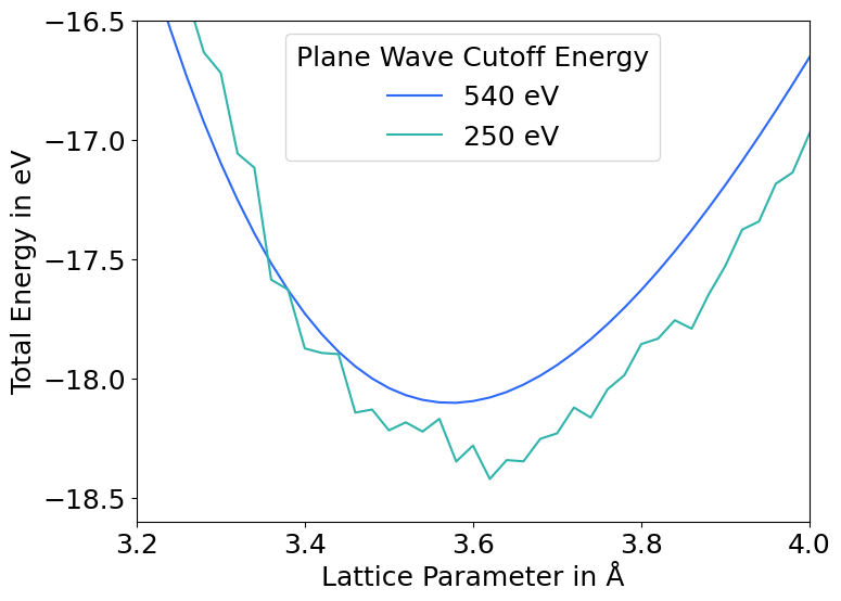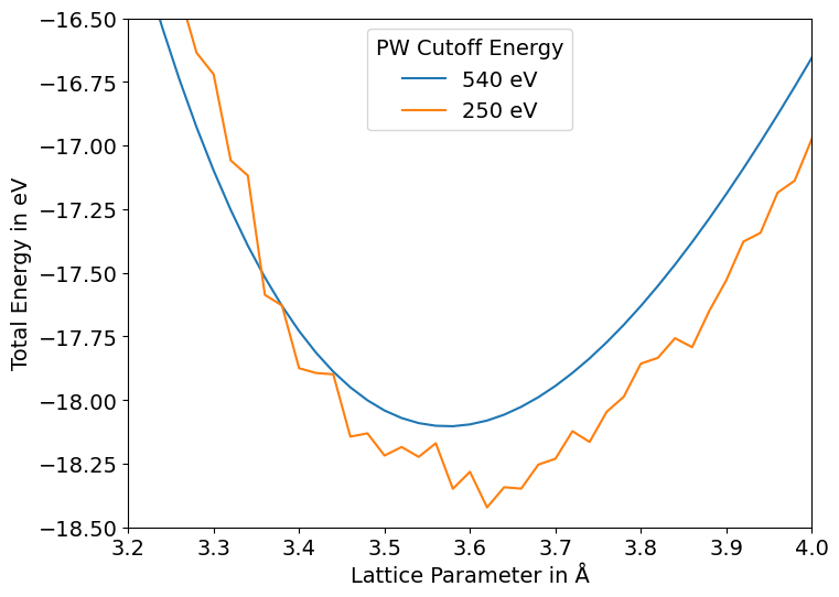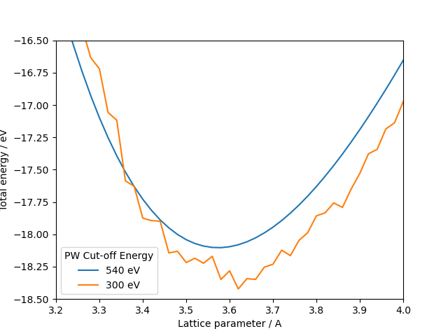 Total energy vs lattice paramter of diamond. 2x2x1 k-point mesh. Two energy cutoffs.