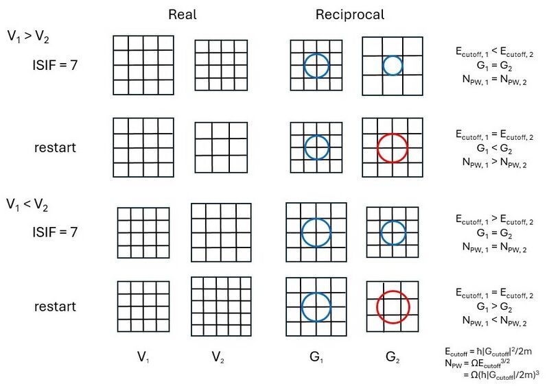 Illustration of volume change on grids, plane wave cutoff, and number of plane waves.