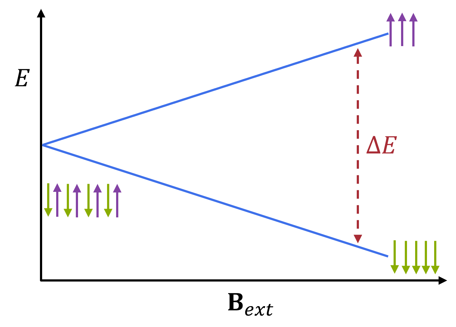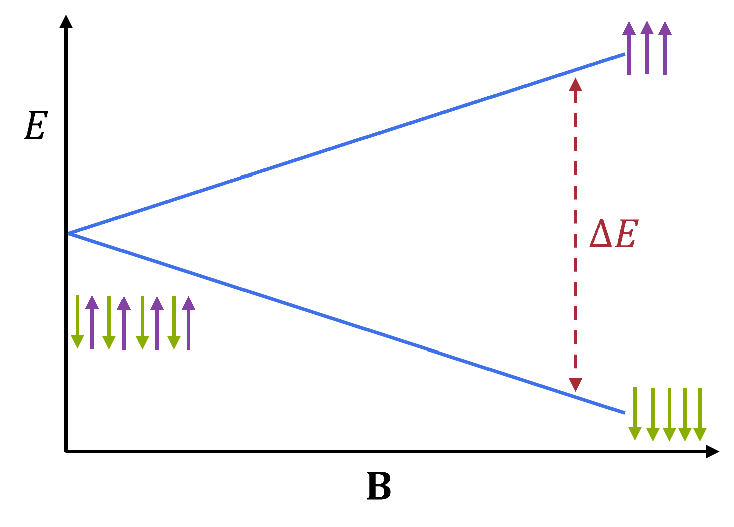 Illustration showing how the energy difference between the spin up and down electrons changes with increasing magnetic field strength. This results in a slight difference in population between the up and down states, the lower energy one being more populated.