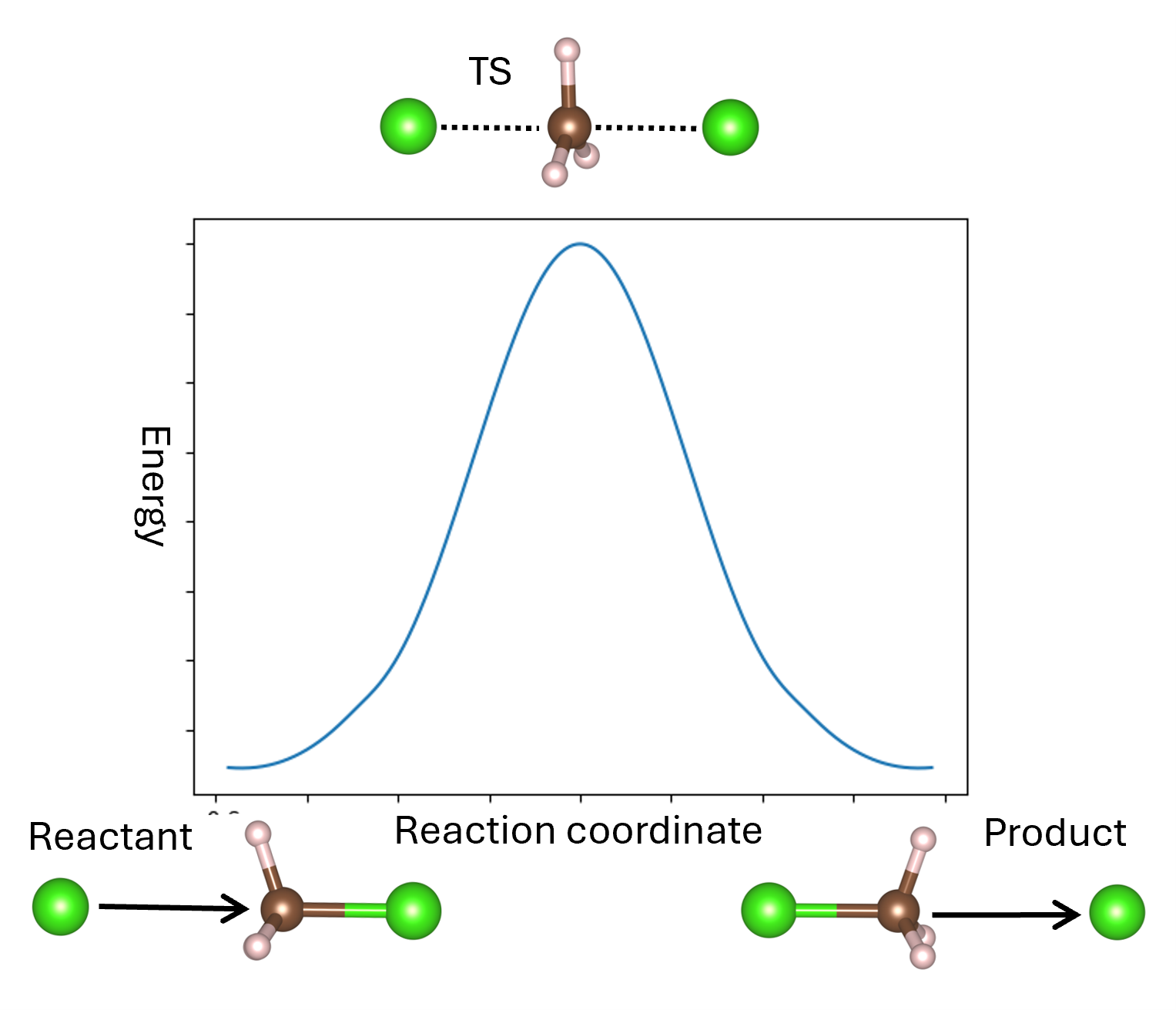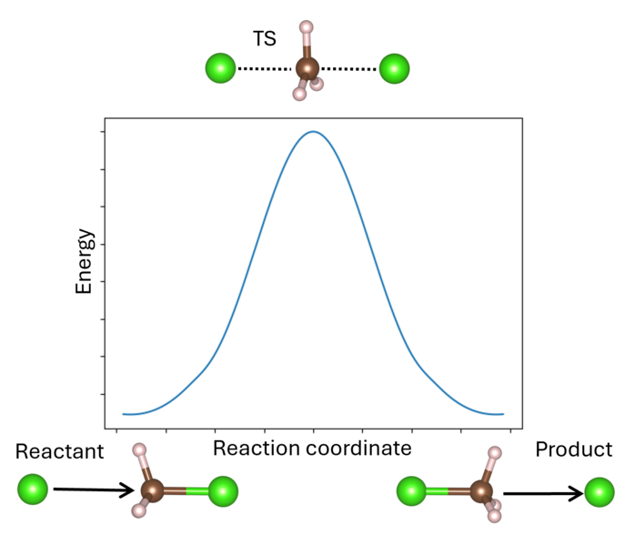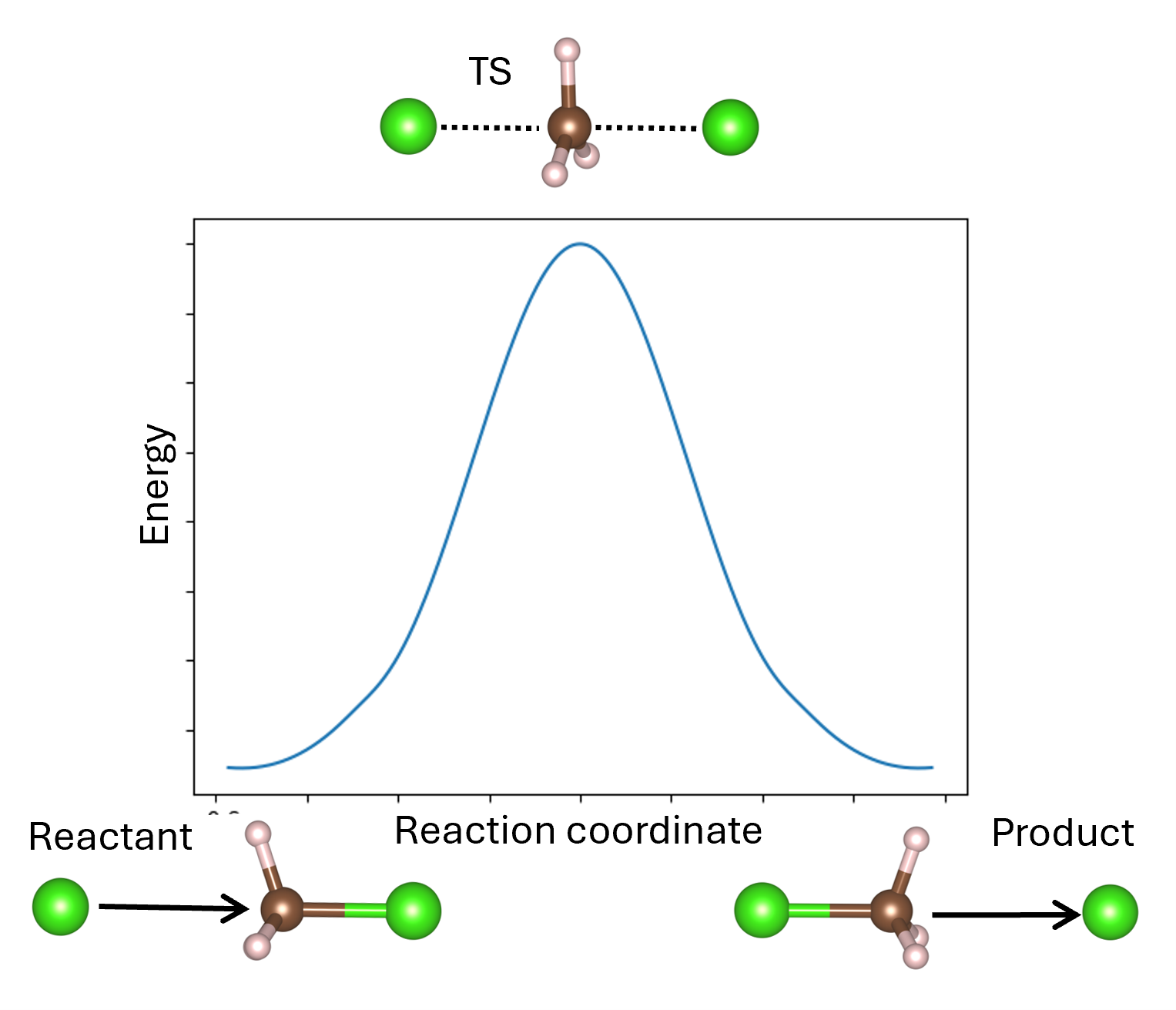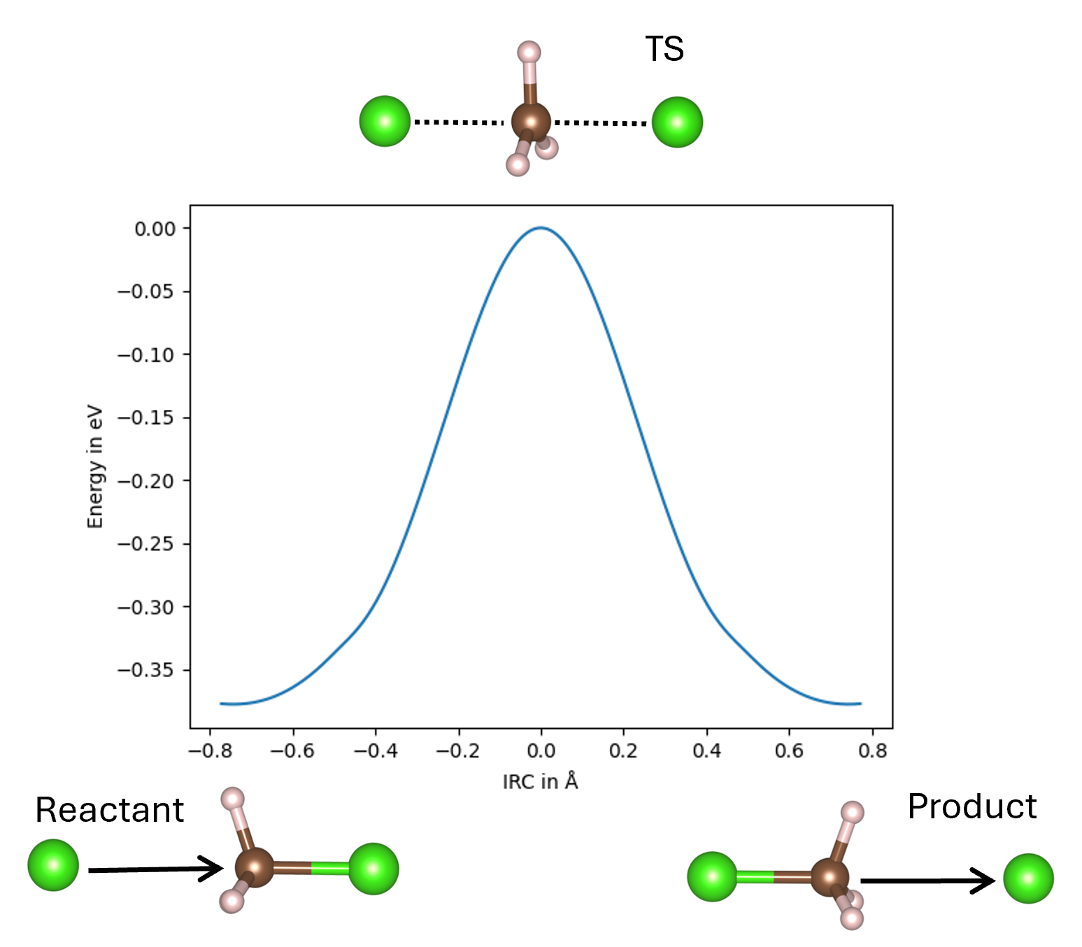 Cl- + CH3Cl --> ClCH3 + Cl- reaction profile with reactants and products