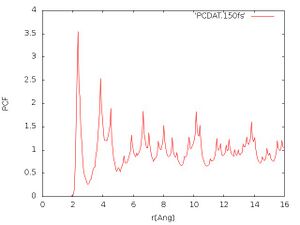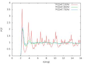 The pair correlation function after 300 fs is written to the file PCDAT.300fs (it is evaluated only in the interval of the last 150 fs since we restarted the calculation):