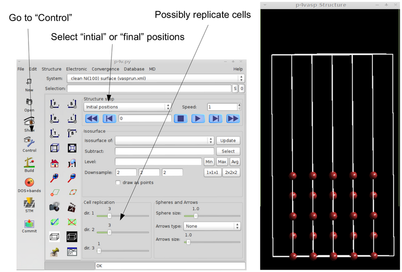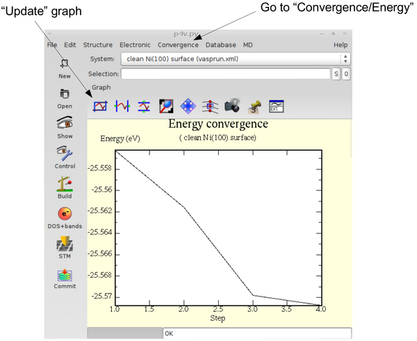 - Energy changes during relaxation from -25.556 to -25.571 eV which gives a relaxation energy of [math]\displaystyle{ E^{\mathrm{rel}} = -15 }[/math] meV. Use p4vasp to check the convergence: