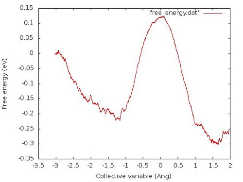 gnuplot -e "set terminal jpeg; set xlabel 'Collective variable (Ang)'; set ylabel 'Free energy (eV)'; set style data lines; plot 'free_energy.dat'" > free_energy.jpg