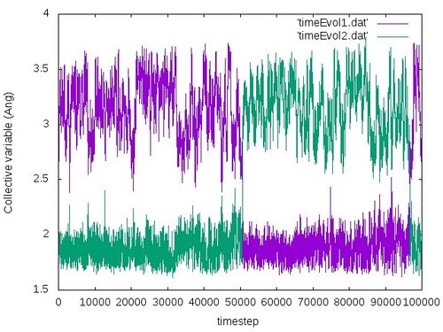 During the simulation, the time evolution of collective variable can be monitored using the script timeEv.sh: