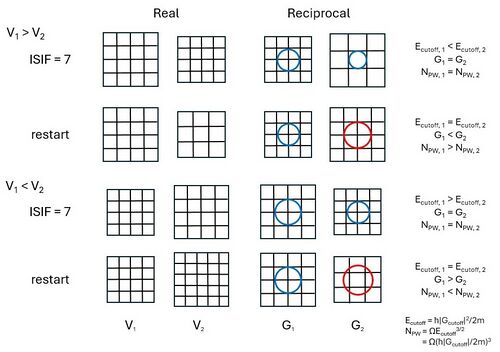 [math]\displaystyle{ N_{PW} }[/math] is constant in a relaxation calculation, which means that [math]\displaystyle{ E_{cutoff} }[/math] must change to compensate for changes in [math]\displaystyle{ \Omega }[/math]. All the initial G-vectors within a sphere are included in the basis. However, when comparing cells of different sizes, i.e. during a relaxation, the cell shape is relaxed, so the direct and reciprocal lattice vectors change. The number of reciprocal G-vectors in the basis is kept fixed but the length of the G-vectors changes, indirectly changing the energy cutoff. In other words, the shape of the cutoff region changes from a sphere to an ellipsoid. This can be solved by using an infinite number of k-points and plane waves. In practice, a large enough plane wave energy cutoff and number of k-points leads to converged energies.[2] All energy changes are strictly consistent with the stress tensor; however, when the basis set is too small, i.e. prematurely truncated, this results in discontinuities in the total energy between cells of varying volumes. These discontinuities between energy and volume create stress that decreases the equilibrium volume, due to the diagonal components of the stress tensor being incorrect. This is called the Pulay stress. Figure 1 (top) show these discontinuities for diamond for prematurely truncated energy cutoffs and k-point meshes, respectively, in comparison to converged curves.