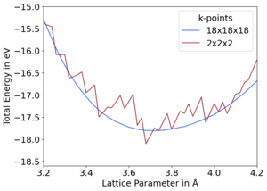 - Use more k-points : this solves the problem, because the criterion for including a plane wave in the basis set is [math]\displaystyle{ \vert {\bf G} + {\bf k} \vert \lt {\bf G}_{\rm cut} }[/math]. This means at each k-point a different basis set is used, and additional plane waves are added at each k-point at different volumes. In turn, the energy vs. volume curve becomes smoother.