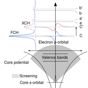 Two different approaches can be used to treat the excited electron in SCH. The excited electron can be placed into the lowest conduction band in the excited electron and core-hole (XCH)[2] approach, alternatively the excited electron can be accounted for by a negative background charge to ensure that the cell remains neutral in the full core-hole (FCH) [3] method. These two approaches are discussed and compared in great detail in Ref. [4]. The main shortcoming of the XCH approach comes from the self-interaction effects of the electron exchange and correlation functional caused when the excited electron is placed in the conduction band, which is more pronounced for strongly localized conduction bands. The effects of the self-interaction error are depicted in the figure on the right, which schematically represents the excitations from the core s-orbital to the lowest unoccupied p-orbital, i.e., the K-edge. The self-interaction error in turn causes two effects: First, it shifts up the energy level of the conduction band occupied by the excited electron from the initial energy C to the new energy C'. Second, it delocalizes the orbital. Furthermore, the conduction band electron additionally contributes to the screening of the core hole, which in turn shifts the higher-lying unoccupied states, as shown in the figure for a and b bands. In FCH, by placing the negative charge in the homogeneous background we avoid such self-interaction effects. For systems, where the lowest conduction bands are strongly delocalized, both XCH and FCH produce very similar results. However, for systems with localized conduction states, e.g. Li-halides, the FCH has been shown to yield better agreement with the results of the BSE+GW calculations as well as the experimental spectra [4].