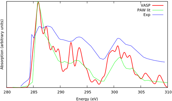 We compare the results obtained with VASP to experimental[1] and theoretical[2] XAS spectra from literature provided in the files C_XAS_aligned_to_VASP.dat and C_PARATEC_aligned_to_VASP.dat, respectively. The theoretical reference calculation was obtained using the PARATEC code and relies on PAW/Pseudopotential similar to VASP. We provide a script with this tutorial to compare these literature results to the spectrum obtained with VASP: