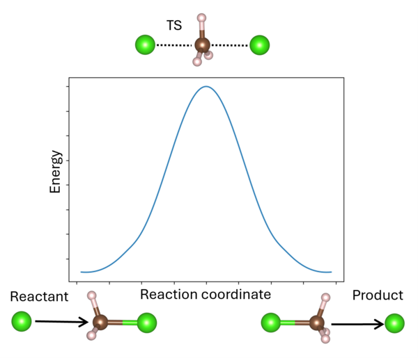 [[File:Transition_state_pathway.png|600px|thumb|left|Reaction profile for the substitution reaction of chloromethane by chloride. This is a symmetric reaction, where the products and reactants are identical. The middle point of the reaction profile is the transition state, labeled TS. The arrows indicate the direction of motion, showing the attack of the chloromethane by one chloride and then the ejection by the new chloride.]] | |||